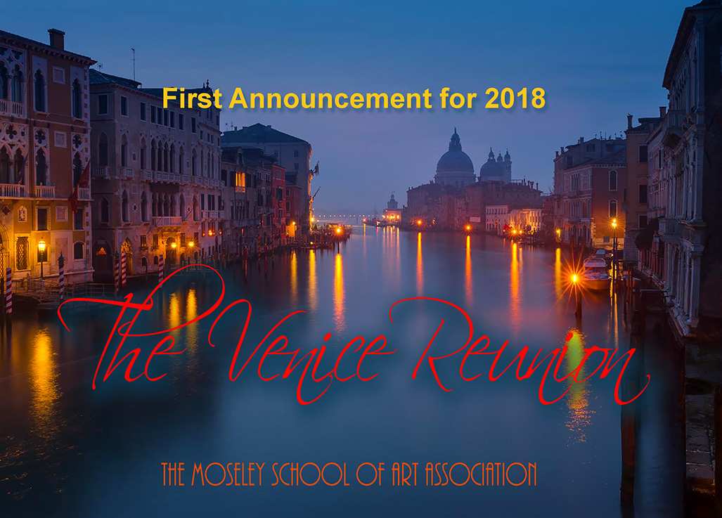HAPPY NEW YEAR TO ALL OUR MEMBERS! PLEASE MAKE SURE THAT WE HAVE YOUR CURRENT EMAIL ADDRESS - Just drop us an email so that we can continue to keep in touch! 2019 Moseley School of Art Association Reunion & Exhibition We'll be sending out our New Year Newsletter to all of our subscribing members shortly with a number of updates, including details of our 2019 Moseley School of Art Association Reunion & Exhibitionon Sunday, 19th. May. 2019 MSA VENICE REUNION - A DATE FOR YOUR DIARY The date for our 2019 MSA Venice Reunion Party has now been fixed! Our dinner party will take place at La Sala Pompeiiana, Hotel Sant'Elena on the 2nd. July 2019. The Jet2 Airlines Moseley Art Special will leave Birmingham Airport at 7am on the 1st. July, arriving at Venice Marco Polo at 10.30am. You can join us by arranging your own flight date, but those flying with us will be able to avoid all the guesswork and join us by arriving in style with a 40-minute trip across the famous lagoon by open air water taxi. The airline has flights on Mondays and Fridays, so you can personally tailor your length of trip to suit yourself. Most of the people who joined us last time felt that they wanted to stay longer than just a few days to explore this fabulously atmospheric city - brimful of art treasures, wonderful architecture, magnificent food and of course the unique Grand Canal and its beautiful canal network. This really is a fabulous experience - most of those who've joined us have said they would like to join us again this year. We'll be staying at the 4* Hotel Sant'Elena again and enjoying the consistently excellent standard we enjoy every year. More details about discounted rates later - please let us know by Emailing us as soon as possible if you're interested as the more that go, the better the deal we can negotiate at the hotel! |